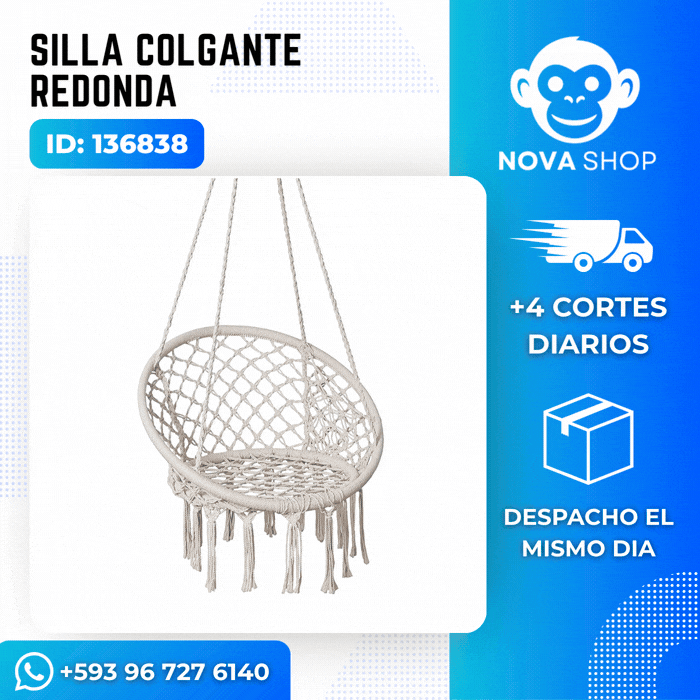 Convierte cualquier rincón en un lugar acogedor y lleno de estilo con esta elegante silla colgante redonda. Perfecta para interiores y exteriores, es el complemento ideal para quienes buscan comodidad, diseño y momentos de descanso en su día a día. Ya sea para leer, meditar o simplemente relajarte, esta silla te brinda una experiencia única de confort.